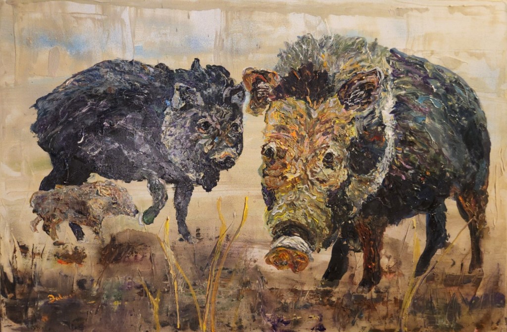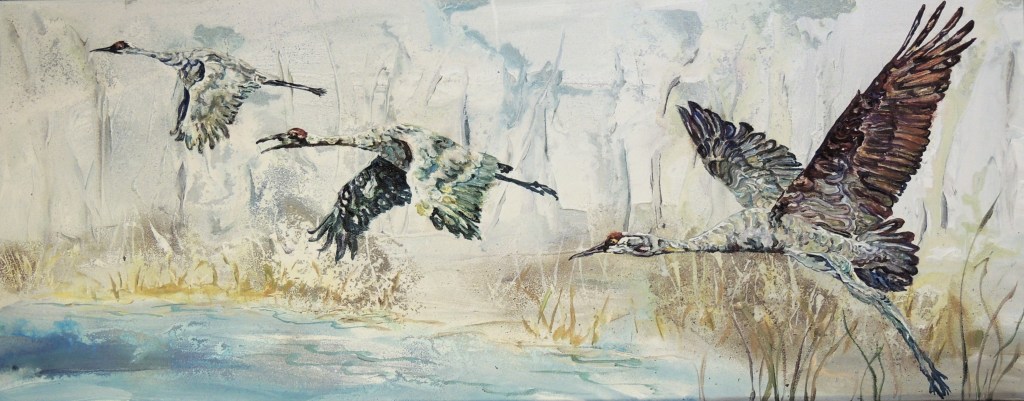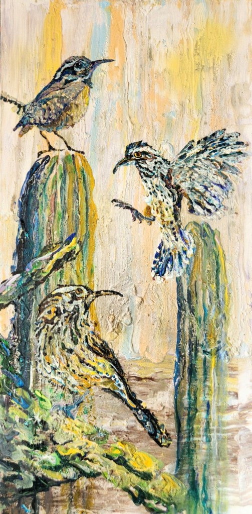 Family 16″x20″, acrylic on gallery canvas – $480 (CDN) or $330 (US)On the Run (Coyotes) 36″x12″, acrylic on gallery canvas – $600 (CDN) or $420 (US)Antelope Jackrabbit 20″x24″, acrylic on gallery canvas – $720 (CDN) or $500 (US)Sandhill Cranes 36″x18″, oil over acrylic on gallery canvas – $750 (CDN) or $525 (US)Cactus Wren 15″x30″, acrylic on gallery canvas – $675 (CDN) or $470 (US)Three Amigos 36″x24″, oil over acrylic on gallery canvas – $1,080 (CDN) or $750 (US)