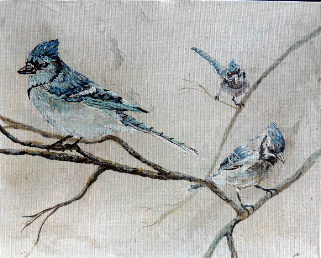 My spirit guide is Red Tailed Hawk and I have been drawn to painting these magnificent raptors and their close Eagle cousins for decades. However, many of the joys of life come in smaller forms – just outside the window, perched on the feeder, cheerfully calling out to each other, celebrating spring.