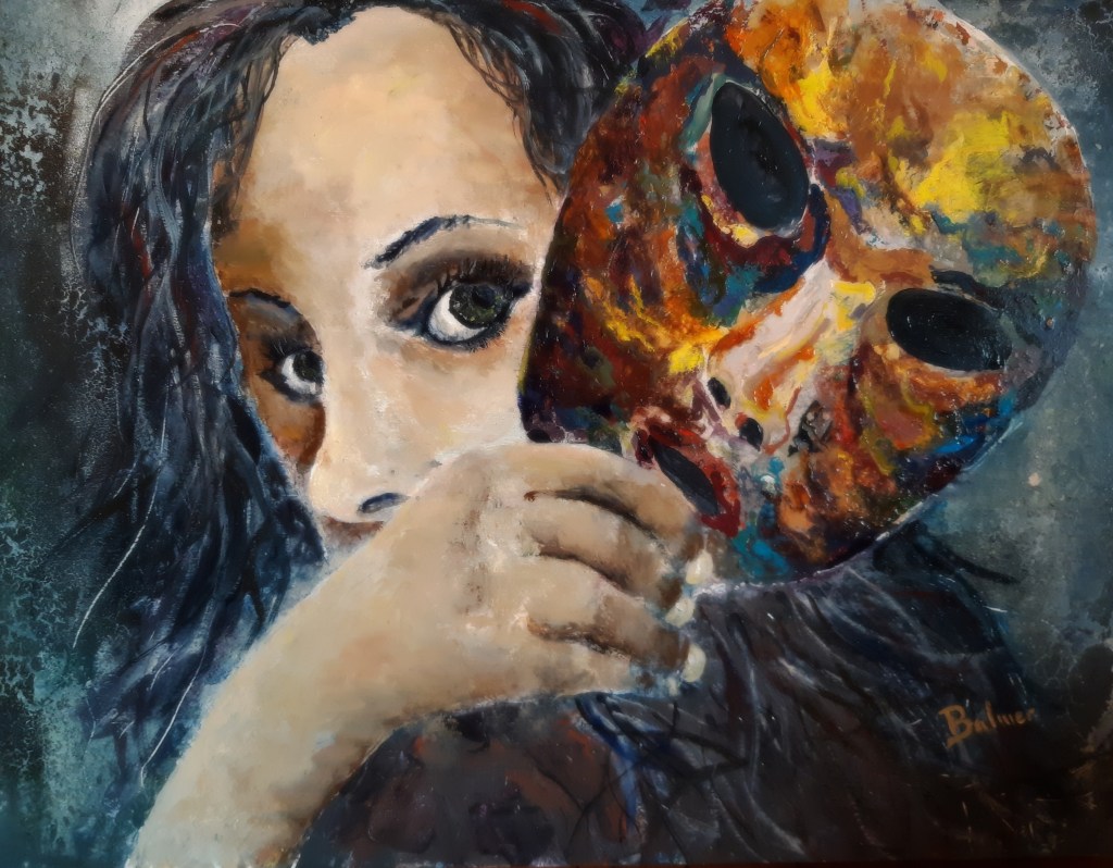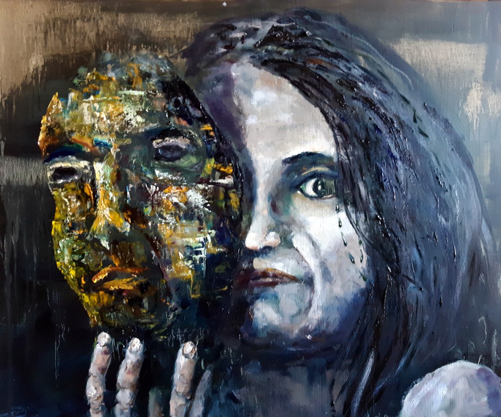 The subject sheds one mask or layer. He or She has yet to realize that there is still another underneath.